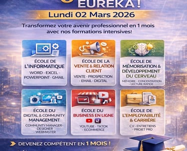 Les Écoles de EUREKA ont été conçues pour permettre à toute personne, quel que soit son niveau, d’acquérir en 30 jours des compétences pratiques, directement exploitables et valorisables sur le marché du travail. Ici, pas de théorie inutile. Chaque compétence apprise est utilisable dès le lendemain.
